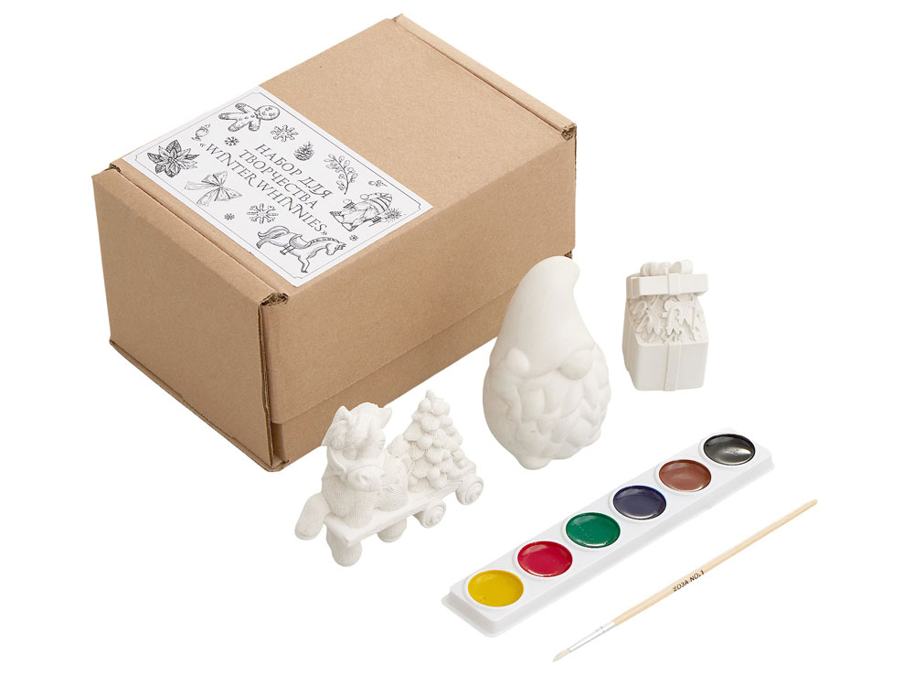 В набор входят три гипсовых фигурки — лошадка елочкой, гном подарочная коробка с пряничными человечками, а также акварельные краски и кисть.