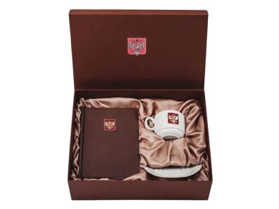 Ежедневник формата А5 с декором Герб РФ на щите и фарфоровая чайная пара с золотой отводкой края чашки и блюдца декорированная металлическим барельефом Двуглавый орел.