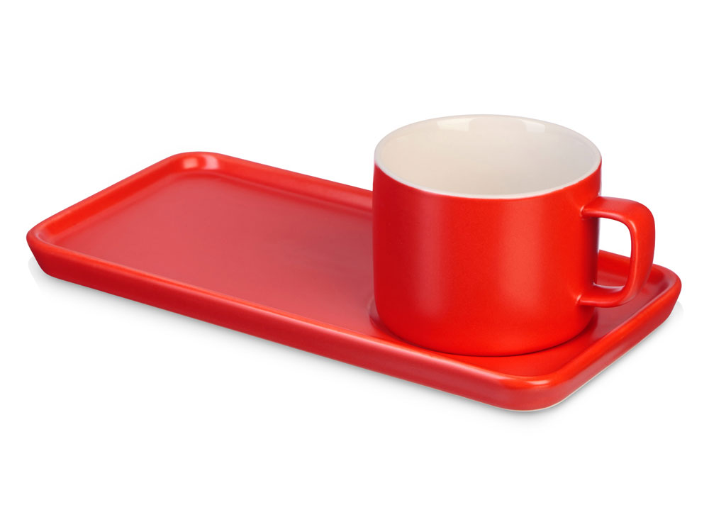 Чайная пара с необычным прямоугольным блюдцем — на нем хватит места не только для чашки, но и для пирожного. Весь силуэт этого комплекта — лаконичный, строгий, прямоугольный, что создает прекрасный фон для нанесения логотипа. Удобство этой чайной пары еще и в том, что для чашки предусмотрена отдельная ниша, которая не даст ей соскользнуть.