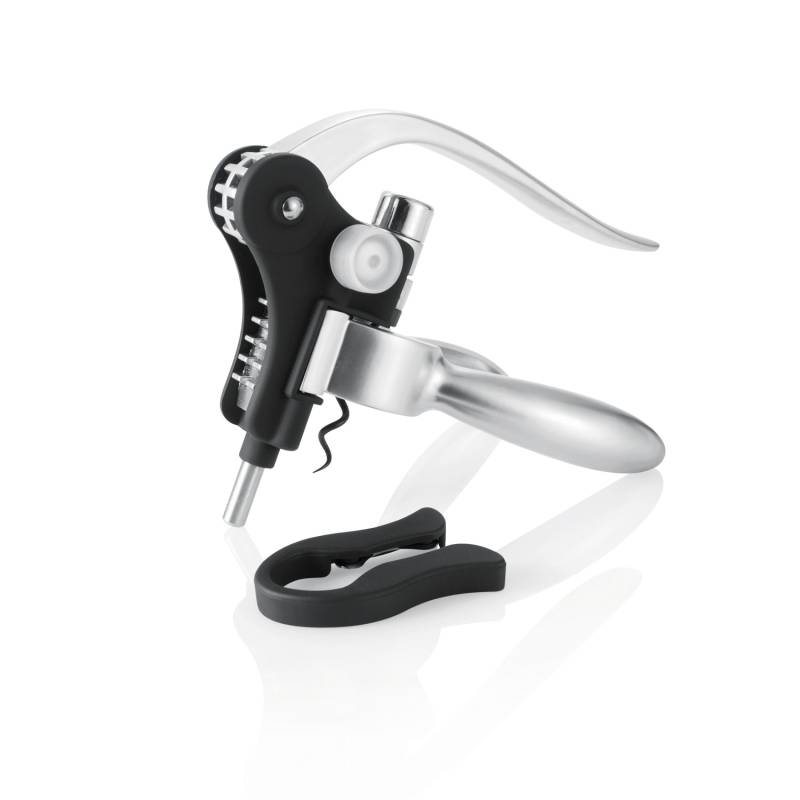 Штопор Executive с рычажным механизмом, изготовленный из алюминия, спираль изготовлена из твердой стали и имеет тефлоновое покрытие, в комплект входят резак для фольги, декоративная пластинка с обзором лучших винных регионов начиная с 1990 года