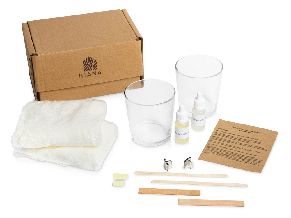 В набор входят сама свечная масса экологичного состава (соевый и кокосовый воск, пищевой парафин), 2 стеклянных стакана, деревянные фитили и держатели, отдушки с ароматами уд-бобы тонка и табак-ваниль и ленточка для декора.