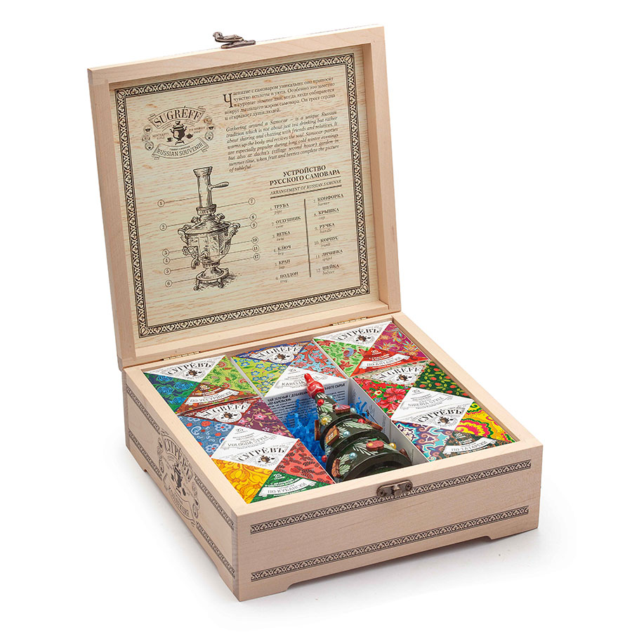 Шкатулка с лого Сугревъ с 7 чаями и подарочной елкой - матрешкой