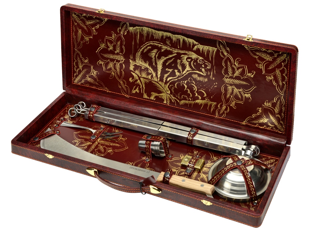 стопки- прозрачный/золотистый, шампура- серебристый/коричневый, дипломат- темно-коричневый