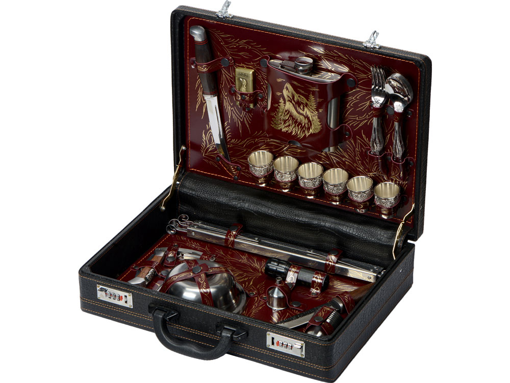стопки- прозрачный/золотистый, шампура- серебристый/коричневый, дипломат- темно-коричневый